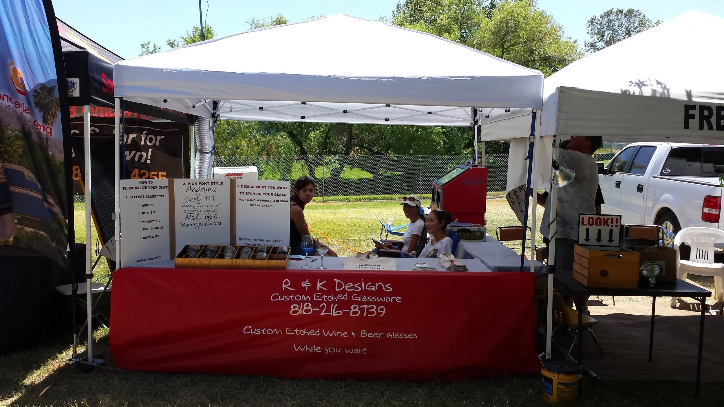 R & K Designs was founded by Rich and King. It started by Rich making etched wine glasses for Christmas presents. After handing out the presents it was suggested that I go to the local wineries and offer my services to them for special events. The wineries were very impressed and asked if we could participate in their wine festivals. I figured out how to make the process mobile, and things took off from there. We came up with designs for those who didn’t want just script or a logo on glassware, so we decided to print those images on shirts.